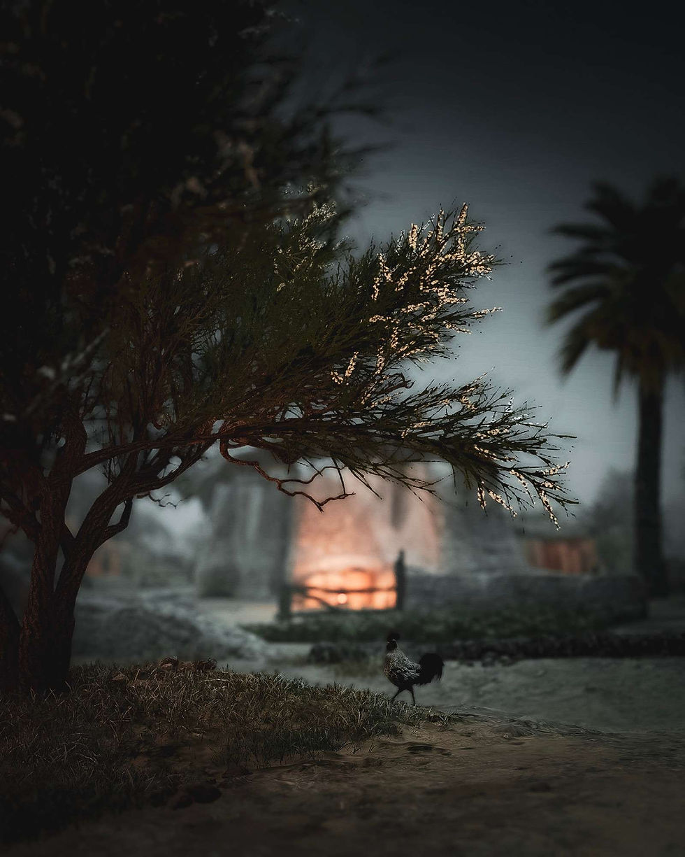 Night lights in the desert have become somewhat of a staple in the series for some time now. There is a familiarity to a building in the distance with a warm glow emitting from it. The thing is you never know if it is friend or foe waiting for you inside. This shot is fulfilling that recognisable moment Basim rolls into town in the middle of the night. The vignette is assisting nicely with the twilight ambience, and the warm orange glow looks inviting. The tips of the tree really standout and remind me of pollen ready to fall. I like that the focus is drawn to the cockerel strutting across the road. We all know how unfriendly these menaces can be.